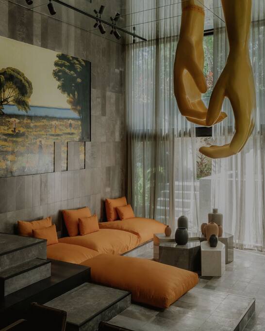 Barneys New York Yellow Garden House , Where Iconic Design Meets Tulum’s Soul Step into Barneys New York Residence Yellow Garden House, a four-bedroom sanctuary where art, architecture, and nature converge. Tucked within the exclusive jungle enclave of Luum Zama, this design-forward villa offers a luxurious yet grounded experience , where each space is curated to awaken the senses and restore the spirit. Begin your days by the serene garden pool, surrounded by lush greenery and sun-drenched tranquility. Prepare meals in the fully equipped SMEG chef’s kitchen, a vibrant space made for both connection and creativity. As you move through the villa, pass beneath dramatic 3-meter hanging hands and cross floating walkways , sculptural elements that evoke wonder and storytelling in every corner. Each suite is a private retreat in itself, with smart TVs, air conditioning, safes, and spa-inspired bathrooms. • The Luxury Master Suite features a queen bed, hand-carved basin, stone finishes, and a private rain shower. • The Balcony Luxury Suite accommodates up to 4 guests with two queen beds and a showstopping bathroom where over 70 handcrafted clay jars are displayed as art, with dual carved sinks and an artisanal rain shower. • The Royal Suite invites with timeless elegance, queen bed, balcony, and stone-wrapped bathroom sanctuary. • The King Size Heaven Suite offers a spacious king bed and a spa bathroom mirroring the clay jar artistry, dual sinks, and natural textures that soothe and inspire. A half bathroom near the kitchen adds convenience with sleek chukum walls and ambient lighting , even the iron has its place. Beyond the villa, you’ll have access to Luum Zama’s yoga shala, spa, outdoor amphitheater, and 24/7 gated security, blending privacy with peace of mind. You’ll also enjoy concierge service, daily cleaning, and access to TPG by the Sea, our private beach club and restaurant. Whether you’re planning a retreat, a design-driven escape, or a tranquil group getaway, Yellow Garden House offers more than a stay it’s an immersion in soulful, sophisticated living. Adults 14+ only for the most serene and curated experience. There is no elevator in the property take your precautions