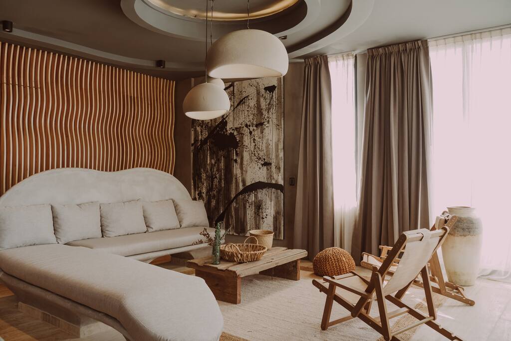 This oceanfront two-story residence blends organic architecture with boho-chic design and warm wood accents. It features four serene bedrooms, including a master suite complete with a private terrace, outdoor shower, and tub, ensuring privacy and comfort. The gourmet kitchen, with its island, opens to a dining area that accommodates up to 10 guests, and luminous living spaces are framed by stunning jungle views. Multiple terraces offer perfect spots for leisurely mornings and memorable sunset.